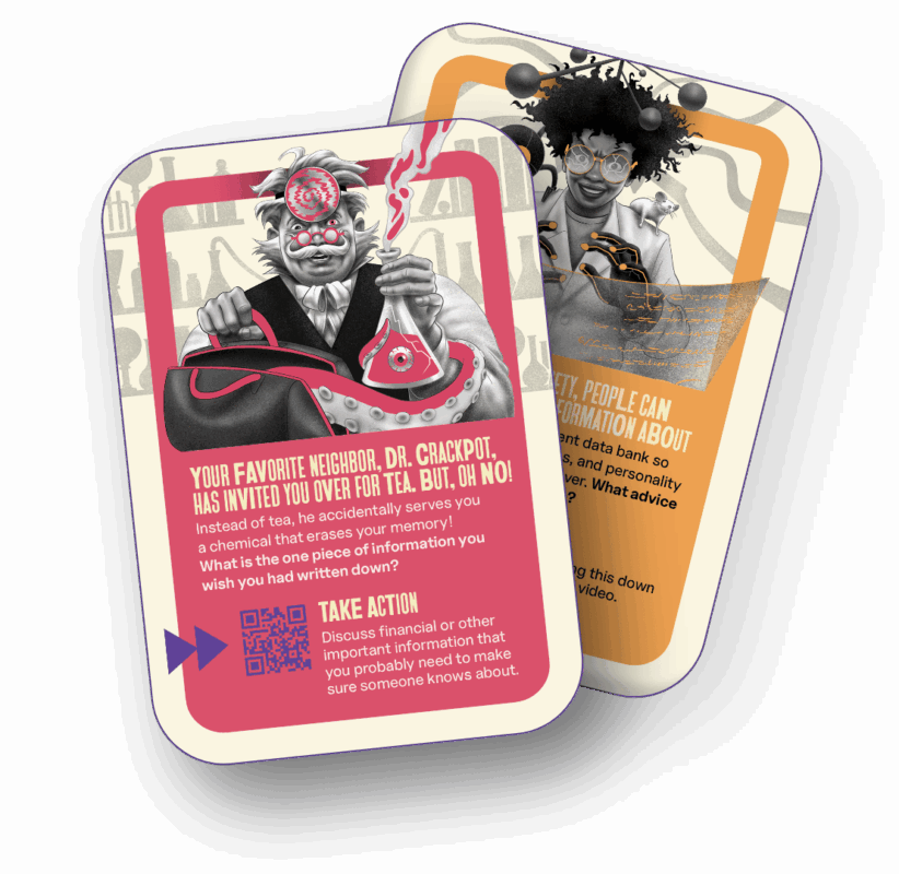 By imagining yourselves in crazy, outlandish situations, you and your loved ones can start planning for what happens in the case of death and serious injury—without the awkward, morbid tone. The cards can help you talk about essential things like medical directives, legal decisions, personal memorials, and financial matters in a way that takes the BOO out of taboo!